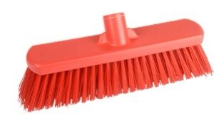 A hygienic broom head designed to meet HACCP (Hazard Analysis and Critical Control Points) standards, featuring soft nylon bristles for effective cleaning without compromising safety in sensitive environments. Color-coded for easy segregation and to help prevent cross-contamination.